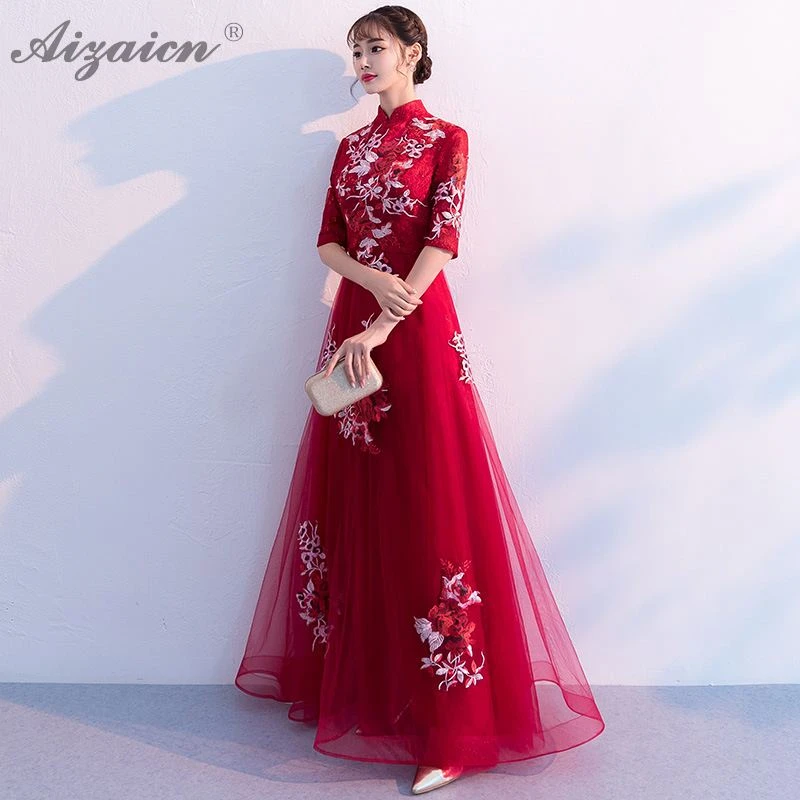 Lace Embroidery Cheongsam Modern Red Bride Evening Dresses Qi Pao