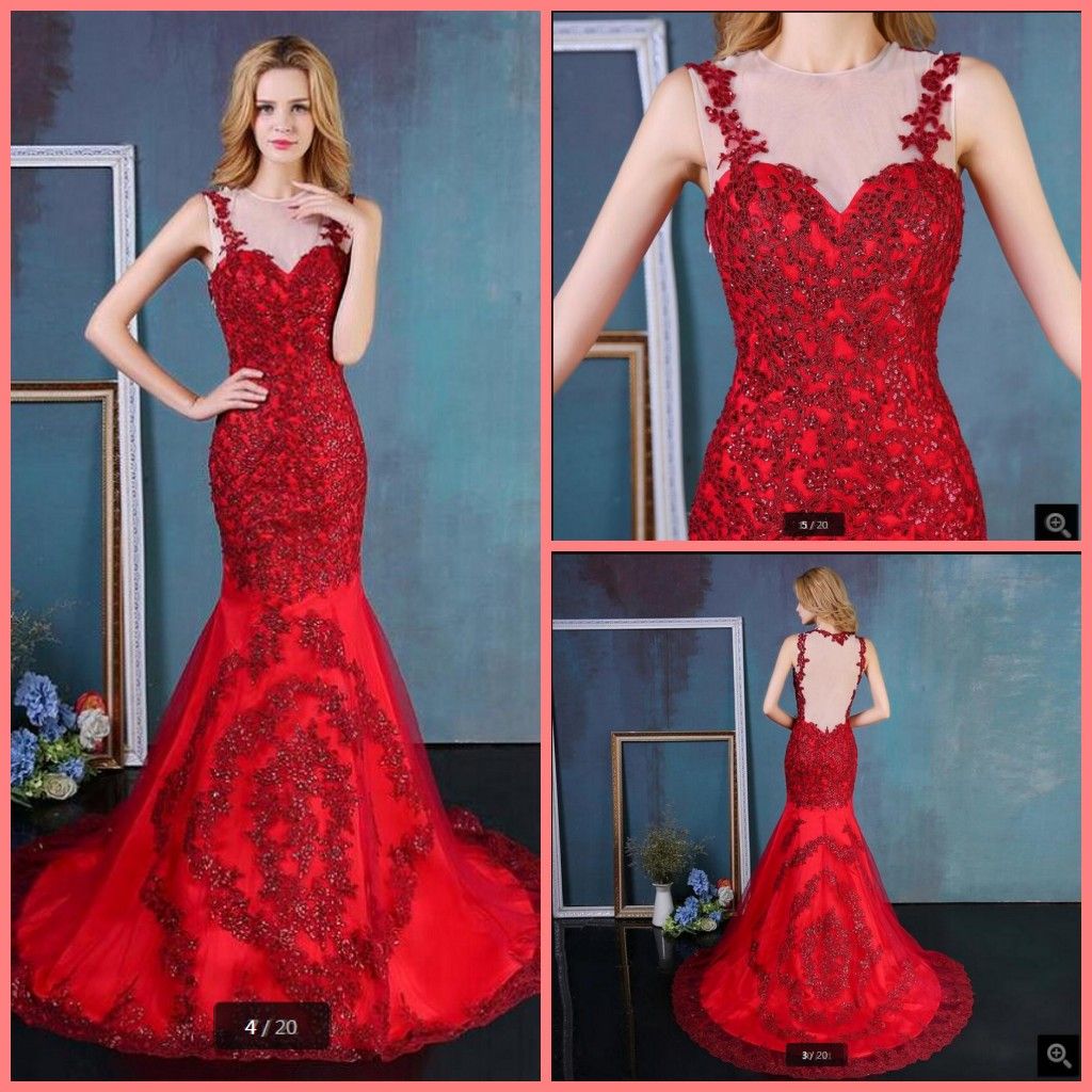 2019 Mermaid Lace Appliques Red Wedding Dress Sheer Back Sexy