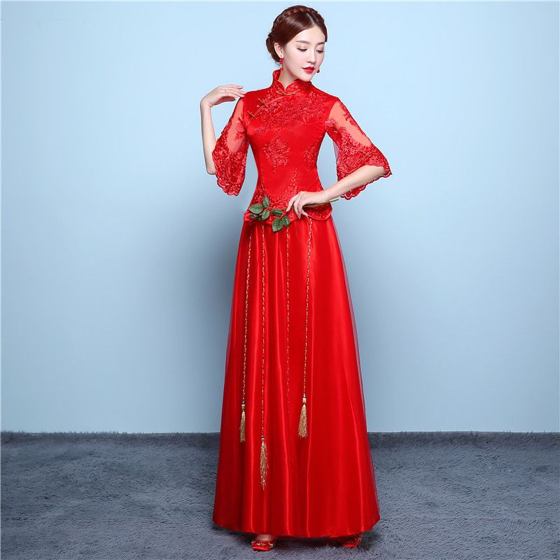 2020 Red Embroidery Cheongsam Modern Qipao Long Chinese Wedding