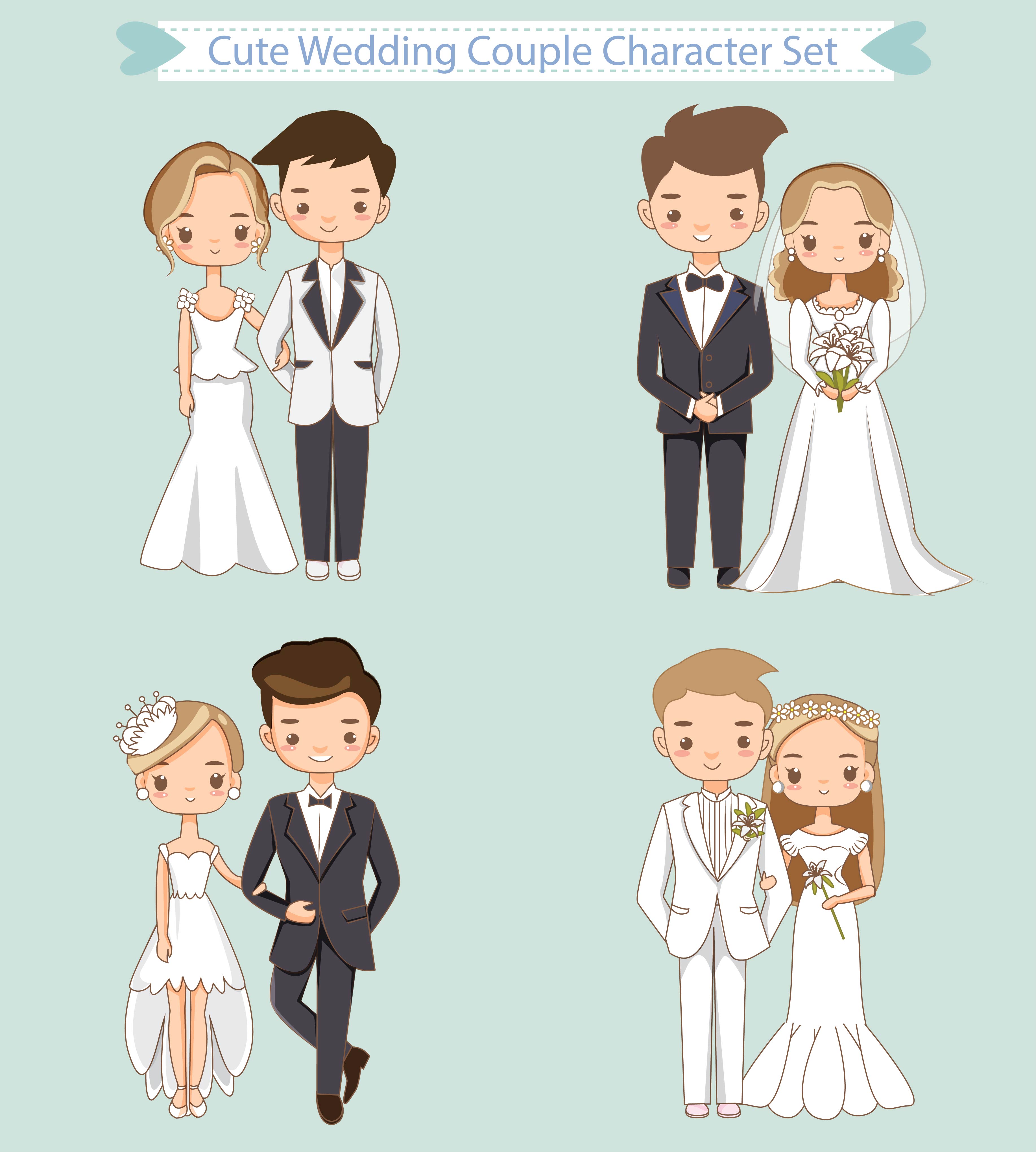 Cute Bride And Groom In Wedding Dress Cartoon Character Collection