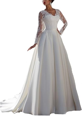 A Lin Ivory Long Sleeve Satin Lace Sweep Train Wedding Dresses