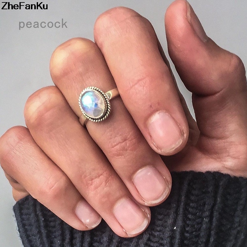 Punk Women Moonstone Ring Oval Natural Stone Wedding Band Female